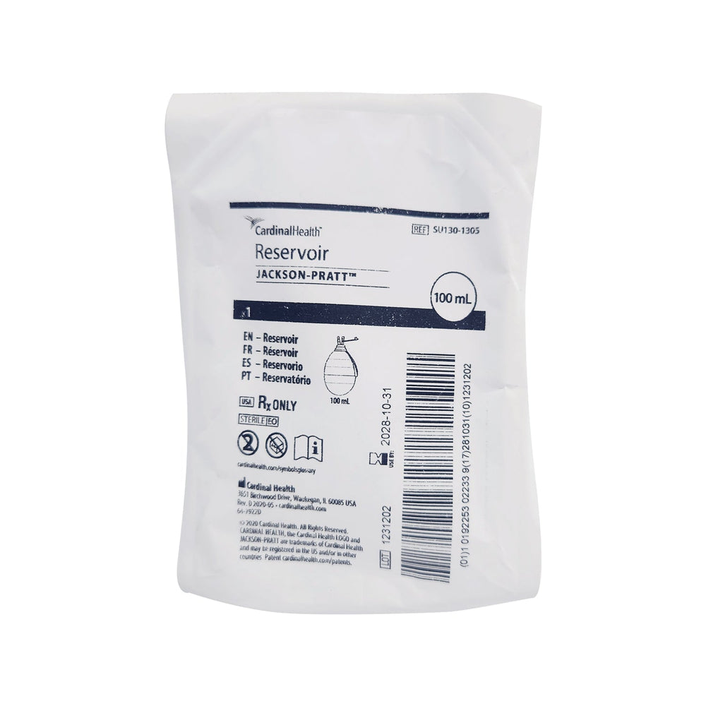 El Reservorio JacksonPratt en forma de pera de 100 ml de la marca Cardinal Health, con el código SU130-1305, es un dispositivo médico utilizado para la recolección de líquidos corporales en procedimientos quirúrgicos. Está diseñado para ser colocado en el cuerpo del paciente y conectado a un sistema de drenaje para eliminar el exceso de líquido y prevenir la acumulación en el área afectada.