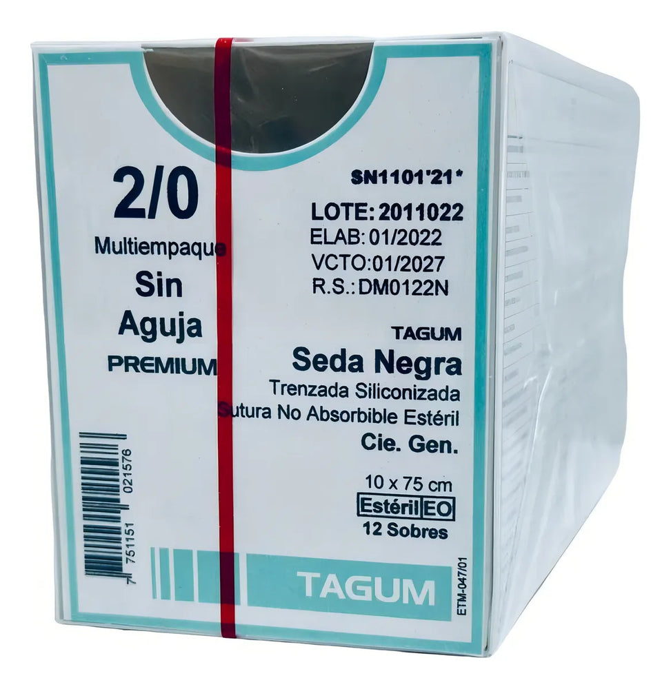 Sutura de seda negra de calibre 2-0, natural, trenzada y no absorbible, ideal para procedimientos quirúrgicos que requieren resistencia y durabilidad. Con una longitud de 10x75 cm, sin aguja, facilitando su uso en diferentes tipos de suturas.